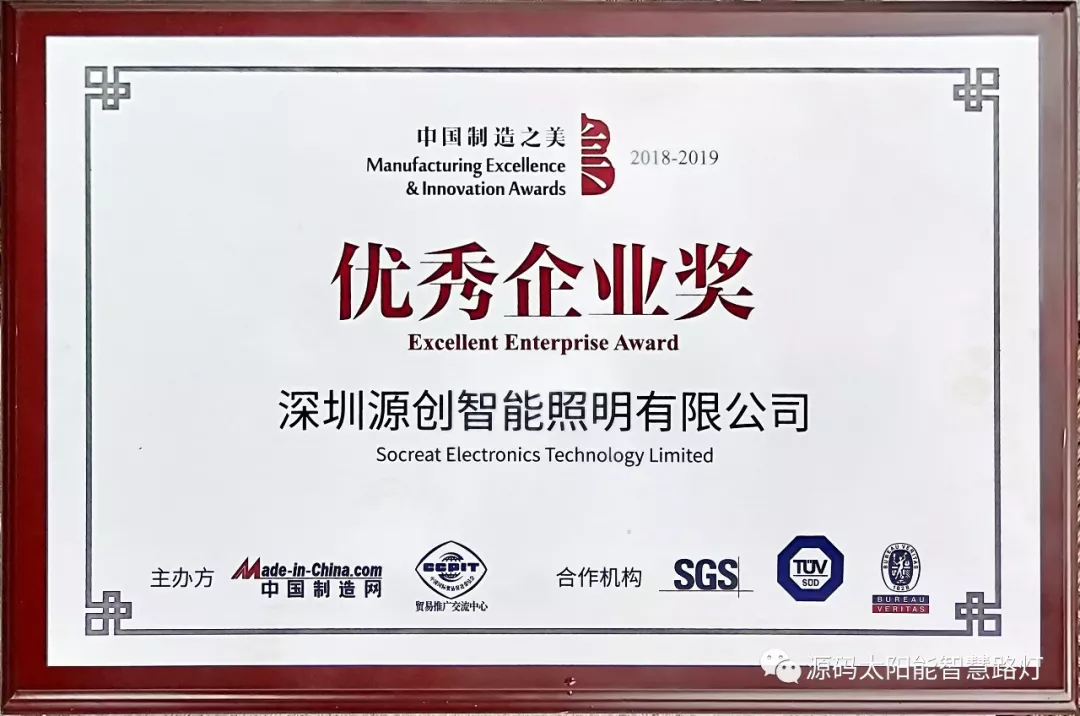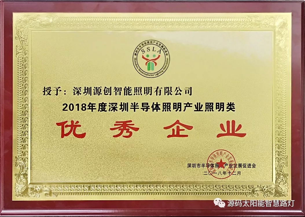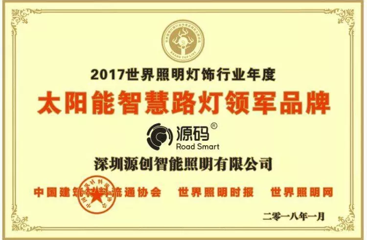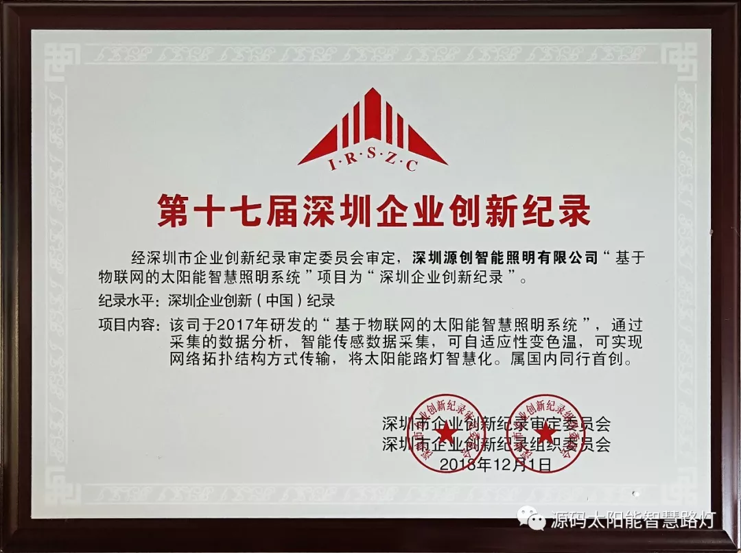 2019年1月9日,第十七屆深圳企業(yè)創(chuàng)新紀(jì)錄成果發(fā)布會暨深圳工業(yè)總會、深圳市先進制造業(yè)聯(lián)合會、深圳市企業(yè)品牌建設(shè)促進會2018年度會員大會在深圳舉行。深圳源創(chuàng)智能照明有限公司,憑借在太陽能路燈創(chuàng)新技術(shù)的突出優(yōu)勢獲得“深圳企業(yè)創(chuàng)新(中國)紀(jì)錄”獎。