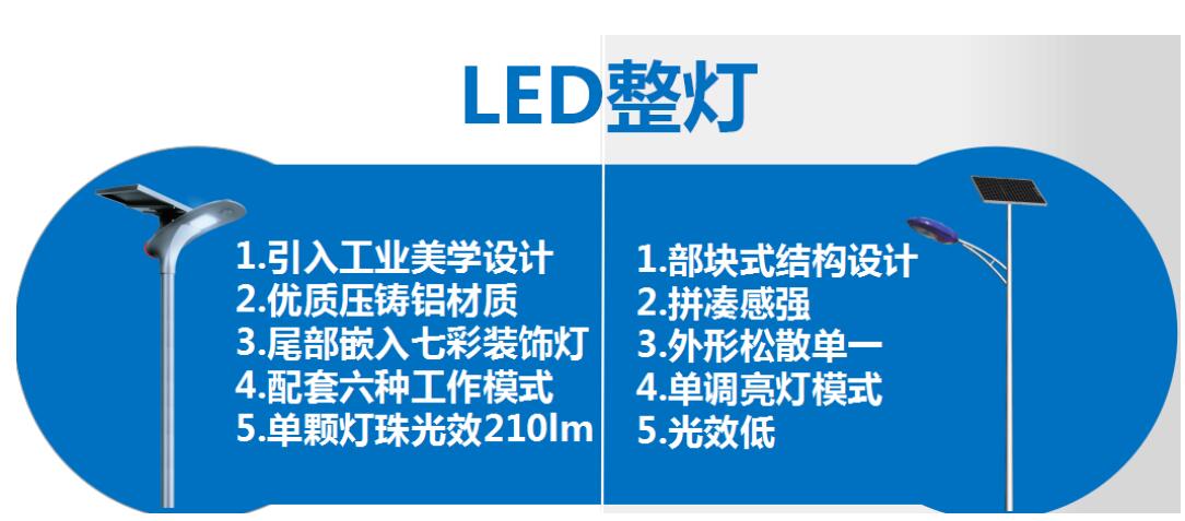 太陽(yáng)能路燈在核心部件、LED整燈、電池、外部結(jié)構(gòu)、太陽(yáng)能板等和傳統(tǒng)路燈有明顯區(qū)別。