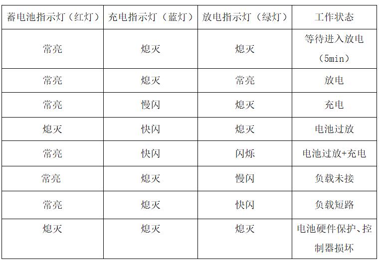 a、所有指示燈不亮,有可能電池過放,電池硬件保護,可第二天白天看指示燈狀態,如紅燈常亮,藍燈閃爍,表示燈具正常充電,則燈具正常;如第二天白天看指示燈狀態均不亮,燈具有問題,需更換燈具配件。