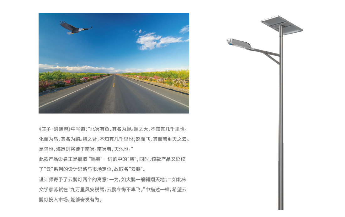云鵬燈作為中大功率分體式太陽(yáng)能路燈,被廣泛應(yīng)用于新農(nóng)村道路、鄉(xiāng)鎮(zhèn)道路、城郊車(chē)道等6-10米的安裝場(chǎng)景。